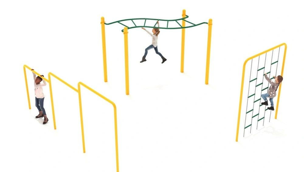 The 3 Piece Basic Kids Gym Course is the ultimate outdoor fitness setup designed to help kids build strength and coordination while having fun. With three dynamic structures, this course challenges children to test their grip strength, endurance, and creativity in a safe, engaging environment. Here’s what makes it the perfect addition to any playground: Wavy Overhead Scaling Ladder: Features a wavy design with unevenly spaced rungs, making it more challenging and fun as kids reach for each rung. Triple Uneven Agility Bars: A mini obstacle course that encourages kids to get creative with pull-ups, hanging, and swinging, all while developing upper body strength. Chain Ladder Climber: A vertical climbing challenge that tests grip strength and coordination. The swinging chain design adds an exciting element to the climb. Strength Development: Designed to enhance upper body and core strength with regular use of all three structures. Durable Construction: Made from weather-resistant, heavy-duty materials to withstand outdoor conditions and frequent use. In summary, the 3 Piece Basic Kids Gym Course is a fantastic way to engage kids in outdoor physical activity while strengthening their bodies. With three challenging structures that focus on grip, coordination, and creativity, this course provides long-lasting fun and fitness for children of all ages.