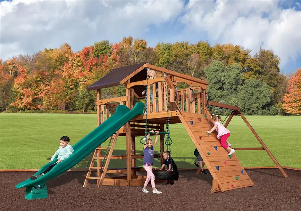 The Adventure Outlook 4 swing set has an exclusive unique hybrid design. The fort structure has a 5' high deck with over 20 sq. ft. of play space. This play structure also includes an Adventure Outlook, brown tarp roof, Olympian Summit tower XL w/ rock wall, tire swivel swing, 3 position 8' swing beam, 3 - belt swings, accessory arm with trapeze bar, picnic table, and 12' rocket slide. Summit Outlook play sets include a limited lifetime warranty on all wood, metal, and hardware components.