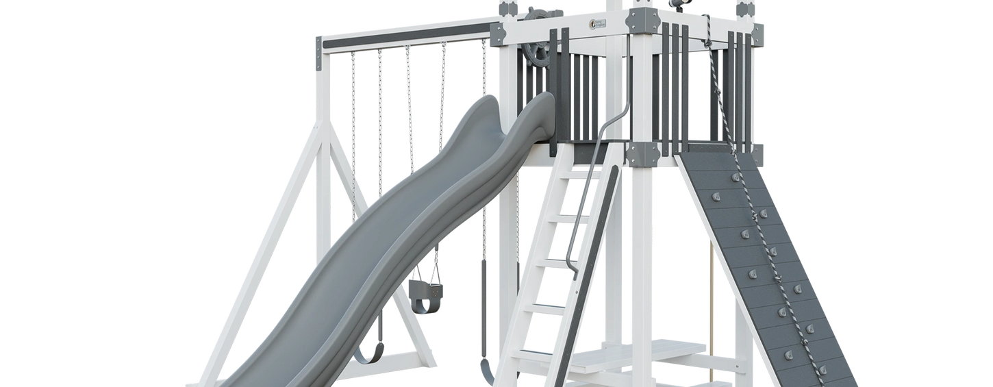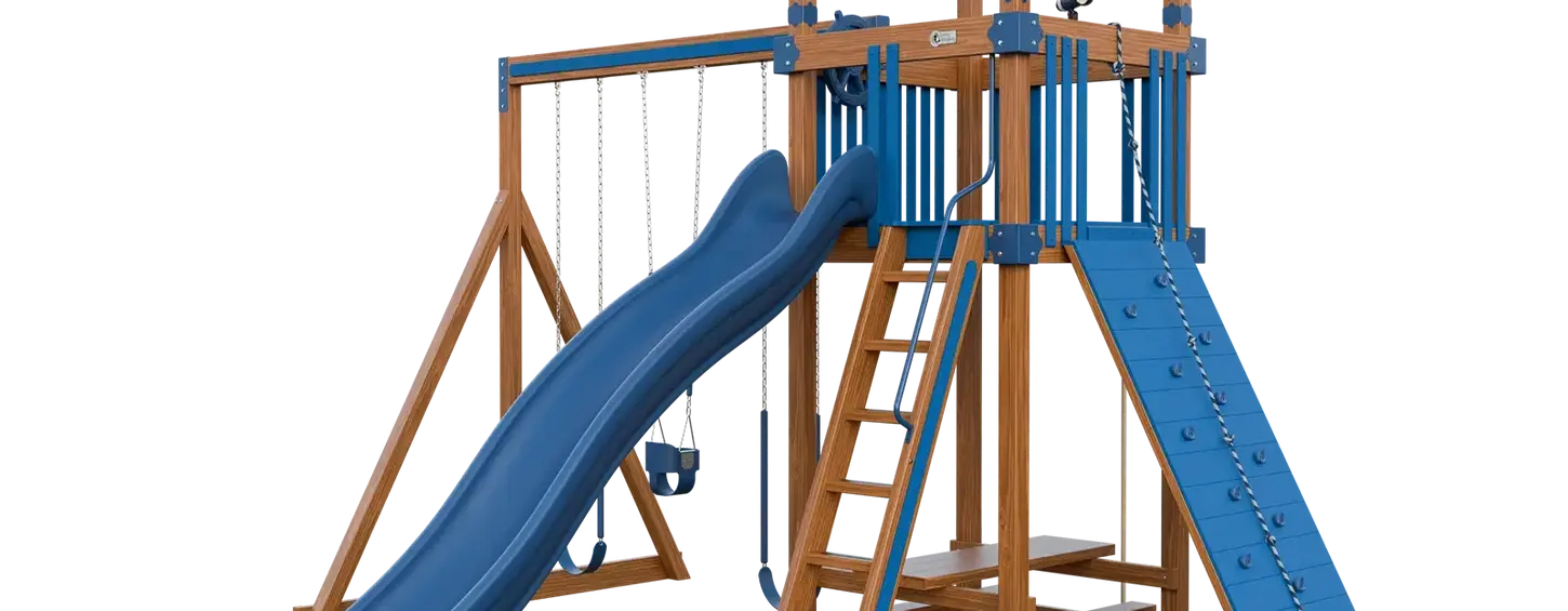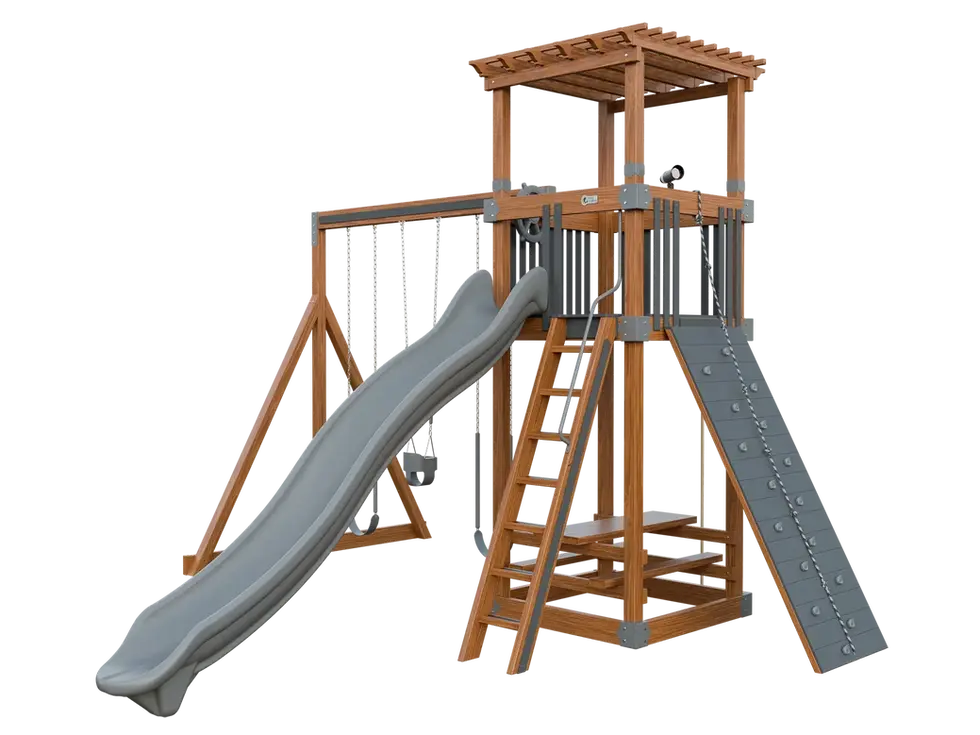 Ideal for aspiring astronomers, this play set features an open pergola roof, perfect for stargazing with a telescope. Kids can invite friends for a picnic at the built-in table, race down the thrilling 14ft Avalanche slide, or make a quick exit via the 7ft firepole. They can also challenge themselves on the 7ft rock wall or swing on one of three different swings. Specifications: Playset Size: 19’ W x 19’ D x 14’ H Space Needed: 28’ W x 28’ D Border Needed: 112’ Recommended Amount of Rubber Mulch: 3 Tons Tower: 5’ x 5’ Deck Height: 7’ Access: 7’ Access Ladder w/ Railing, 3’ x 7’ Rock Wall w/ Rope Roof: 5’ x 5’ Pergola Slide: 14’ Avalanche Swing Beam: 3 Position Single High Swings: (2) Belt Swings High Beam, Rubber Infant Swing High Beam Fun Items: 7’ Fire Pole, Telescope, Ship’s Wheel, 5’ x 5’ Picnic Table Anchors: 2 EXPERT INSTALLATION $500