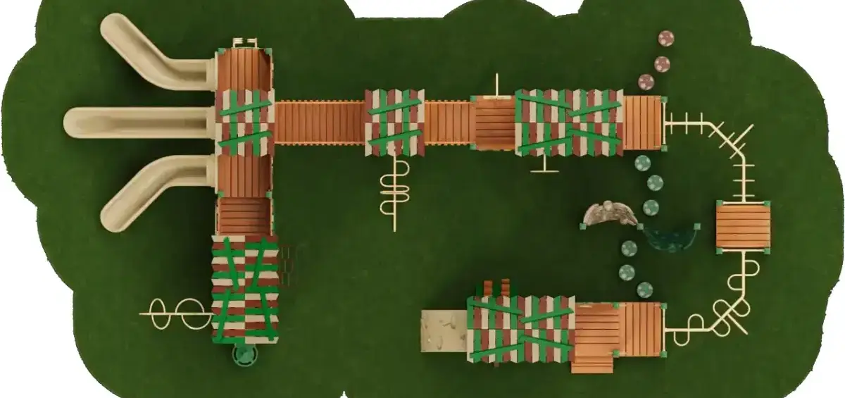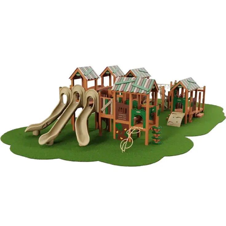Multiple interconnected playhouses and elevated platforms offer a continuous, immersive play journey.