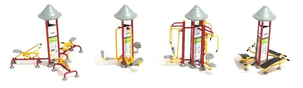 The Feel The Burn Course offers a compact yet effective fitness solution with four versatile pieces of equipment designed to target key muscle groups and improve overall strength and endurance. Whether you're training solo or with friends, this course is ideal for group workouts, allowing up to three people to work out simultaneously. Royal Triple Station Rower : Focuses on toning and strengthening back and arm muscles, offering a full-body cardio workout. Royal Triple Station Leg Press : Targets the legs, helping you build strong and sculpted lower body muscles. Royal Triple Station Chest Press : Perfect for developing chest strength and achieving that sought-after chest pump. Royal Station Sit-Up Bench : Designed to work the core and abdominal muscles, helping you build those beach-ready abs. Group-Friendly Design : Each piece of equipment accommodates up to three users at once, making it a great option for shared spaces like parks or gyms. User-Friendly : Clear guidelines on each machine ensure that users can get started with minimal instruction, making it accessible for all fitness levels. The Feel The Burn Course is perfect for those who love to socialize while getting fit, providing a fun and efficient way to build strength, endurance, and cardiovascular health—all in a shared, outdoor setting!