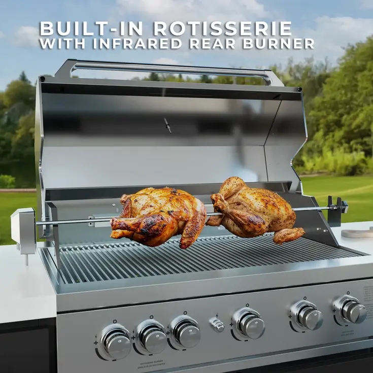 Professional Grill: 38-inch, 5-burner stainless steel with 72,000 BTUs, rotisserie, sear zone, warming rack, and flame tamers (includes cover)