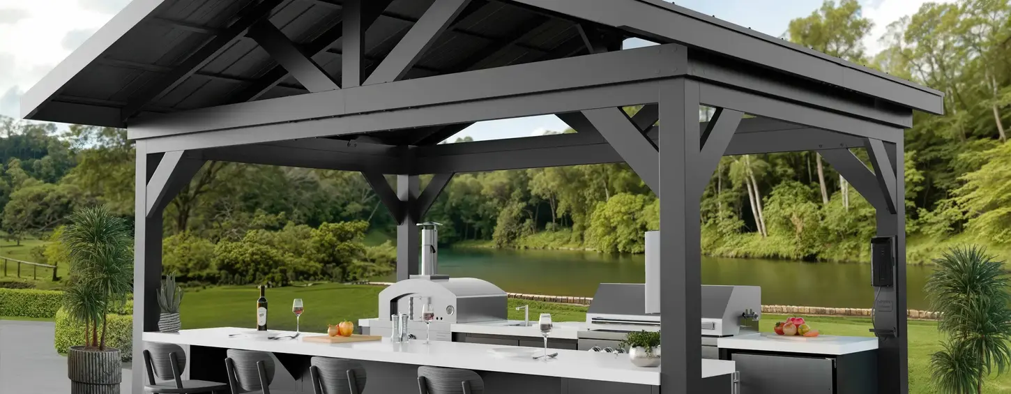 The Lancaster Galley Outdoor Kitchen from Backyard Discovery combines all-weather protection, premium appliances, and modern marble finishes into a fully covered galley-style design with a spacious bar and cooking area.