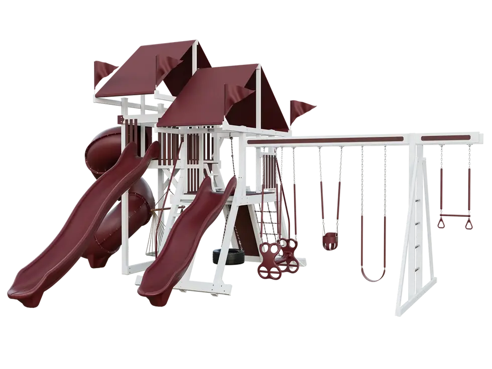 This amazing playset is designed to keep kids entertained and challenged for hours! It features a 5′ MC ladder for easy access to the upper deck, where kids can enjoy three slides : a 10′ Avalanche slide , a 14′ Avalanche slide , and a 7′ Turbo Twister slide . With six swinging options —including a belt swing , trapeze bar , tire swing , dual glider , hammock swing , and infant swing —there’s something for everyone. For adventurous kids, a rock wall and cargo net provide a fun challenge to test their strength and agility. This playset is perfect for kids of all ages and abilities, offering endless fun and exercise. Product Details Playset Size: 30’ W x 21’ D x 15’ H Space Needed: 38’ W x 30’ D Towers: 5’ x 5’ MC, Mega 7’ Deck for MC Deck Heights: 5’, 7’ Access: 5’ MC Ladder w/ MC Handrail, Rock Wall for MC Leg, Cargo Net for MC Leg Roofs: (2) 5’ x 10’ Canvas w/ Flags Includes Slides: 10’ Avalanche, 14’ Avalanche, 7’ Turbo Twister Swing Beam: 4 Position Climber Swings: Belt Swing, Trapeze w/ Rings, Rubber Infant Swing, Dual Rider, 3-Rope Tire Swing, Hammock Swing Fun Item: Megaphone Anchors: 2