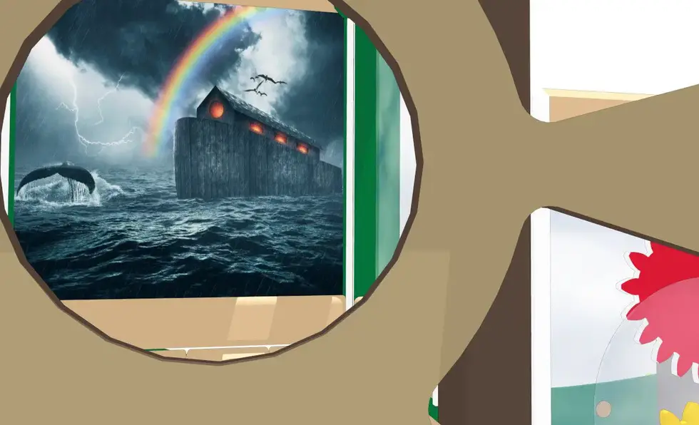 Colorful farm-meets-railway themed play structure for infants and young toddlers
