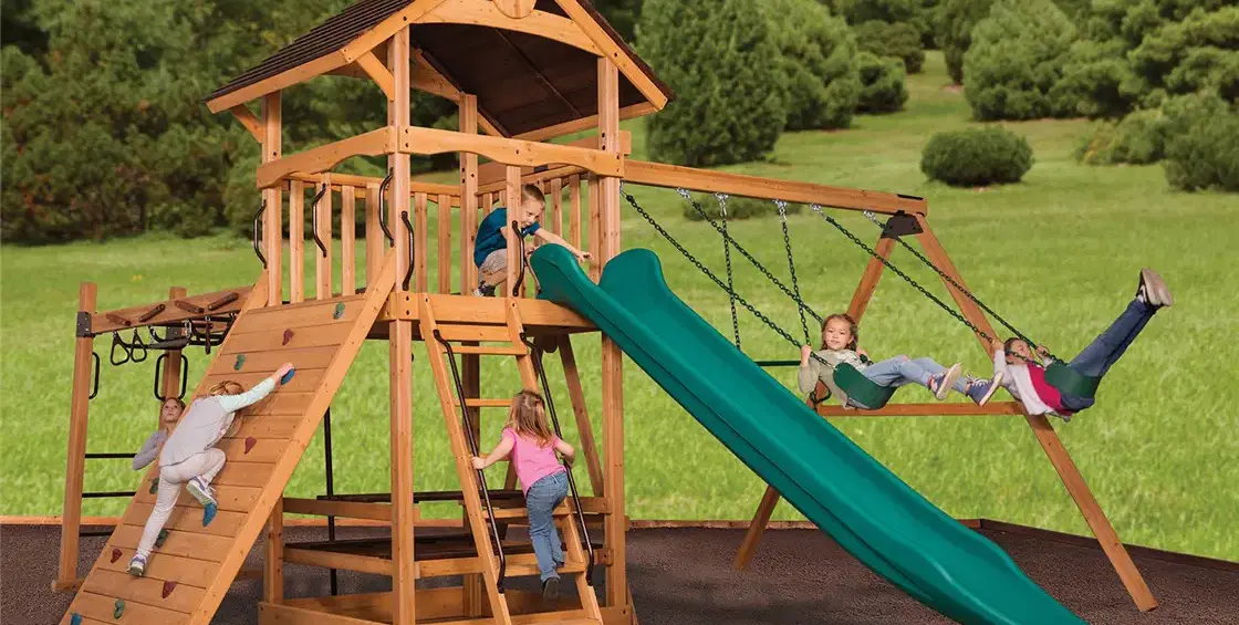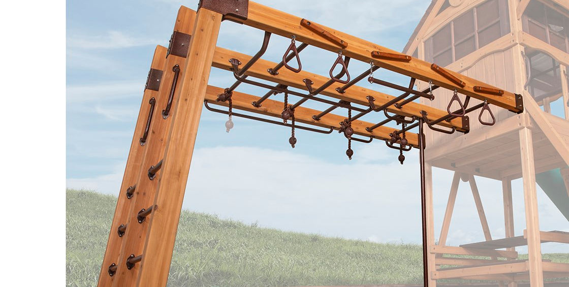 The Olympian Outlook XL 1B swing set features the Ultimate Climber loaded with all kinds of strength, dexterity, and climbing features! The fort structure has a 6' high deck with over 25 sq. ft. of play space. This play structure also includes wood roof, gable kit, 3 position swing beam, 2 - belt swings, trapeze bar, ultimate climber, 6' rock wall, picnic table, and 12' rocket slide. Summit Outlook play sets include a limited lifetime warranty on all wood, metal, and hardware components.