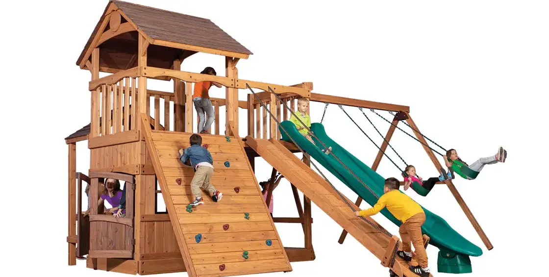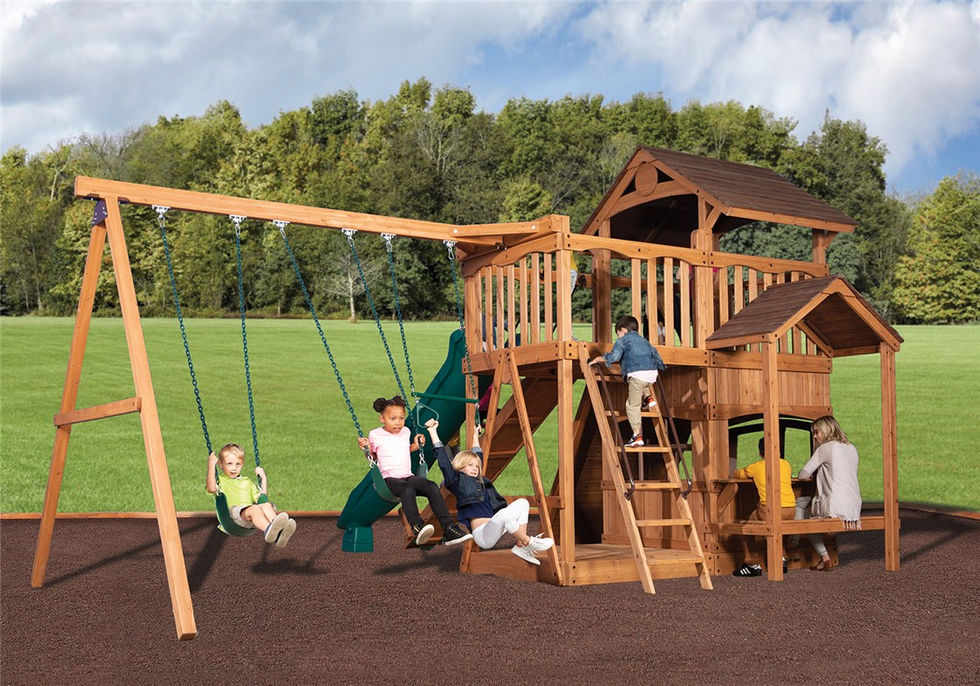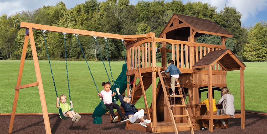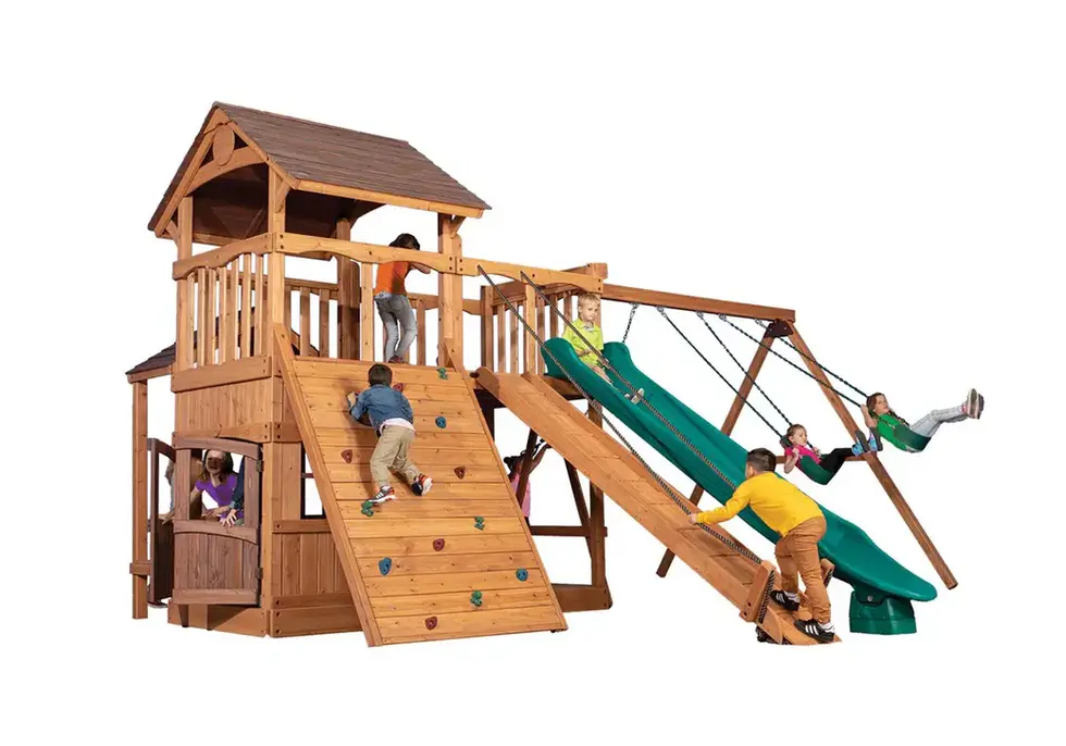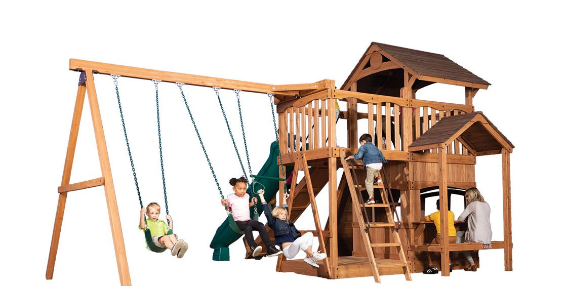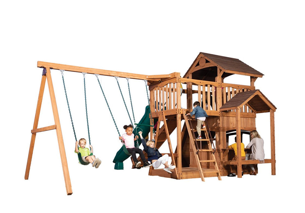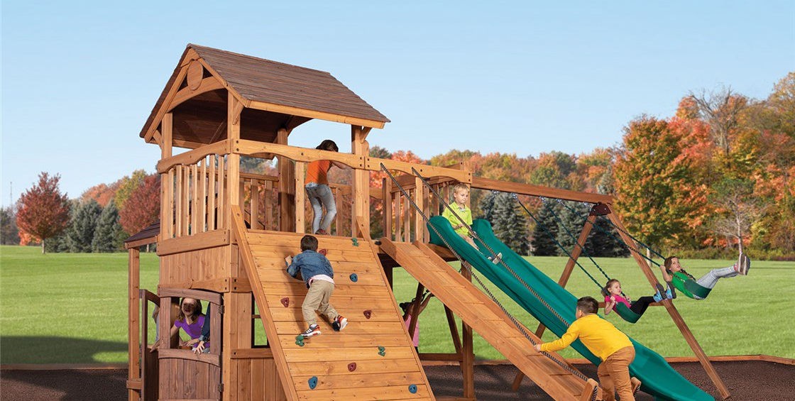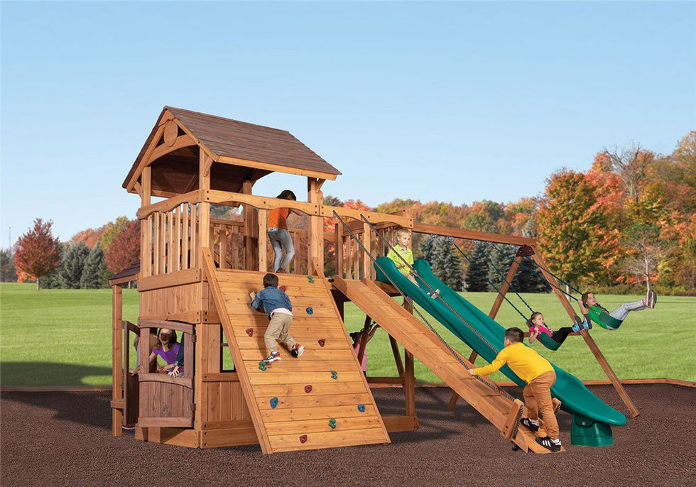 The Olympian Outlook XL 2 swing set is loaded with great features and has a great price. The fort structure has 6' high decks with over 50 sq. ft. of play space. This play structure also includes wood roof, gable kit, olympian outlook balcony, 3 position 9' swing beam, 2 - belt swings, trapeze bar, 6' rock wall XL, lower floor XL, playhouse XL, side table with roof, gang plank, and 12' rocket slide. Summit Outlook play sets include a limited lifetime warranty on all wood, metal, and hardware components.