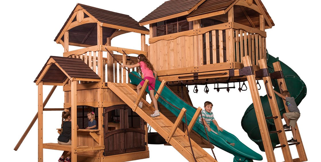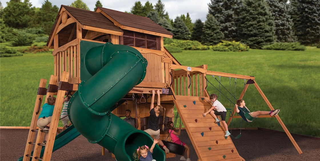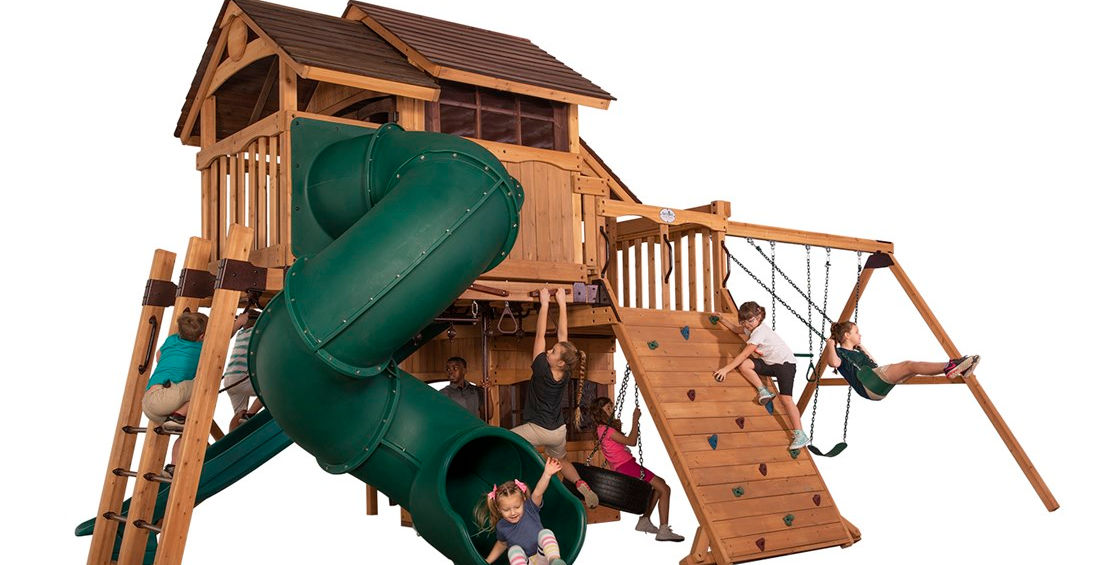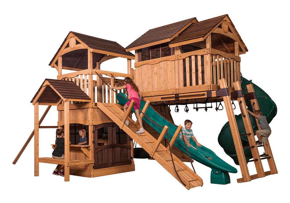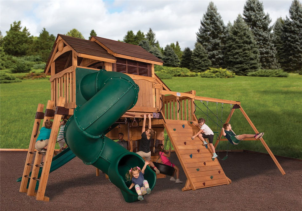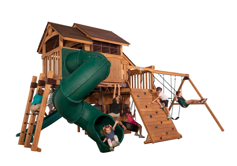 The Olympian Outlook XL 5 swing set is our incredible new monster playset with all our best features! The fort structure has 6' and 7' high decks with over 90 sq. ft. of play space. This play structure also includes wood roof XL, gable kit, olympian summit balcony XL with rock wall, tire swivel swing, 3 position 9' swing beam, 2 - belt swings, trapeze bar, playhouse XL, side table with roof, ultimate climber, loft XL, cabin package, loft porch, 7' spiral tube slide, gang plank, and 12' rocket slide. Summit Outlook play sets include a limited lifetime warranty on all wood, metal, and hardware components.