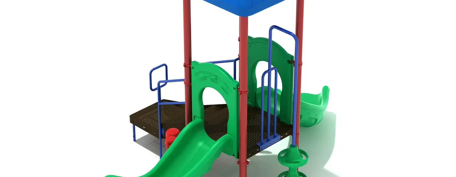 QUICKSHIP ITEM! The Powell's Bay activity center is the perfect compact play structure for smaller playgrounds or daycare centers catering to younger children. Packed with fun features, it offers plenty to explore. Kids can easily climb aboard via the Transfer Station or take a more adventurous route up the Pod Climber, which features circular disks for a fun challenge. Once they reach the top, the only decision left is which slide to choose— the Powell's Bay playset offers both a Left Turn Slide and a Right Turn Slide, perfect for a fast and exciting descent. The Ship’s Wheel adds a tactile element to play, sparking imagination as children pretend they are captains steering a sailing ship. Beneath the structure, a set of Bongos invites kids to make rhythmic sounds, adding a musical touch to their adventurous playtime. In stock items typically ship in 2-4 weeks. Installation not included. For an installation quote or any other questions, please contact Tarik Alherimi: tarik@pinestaterecreation.com