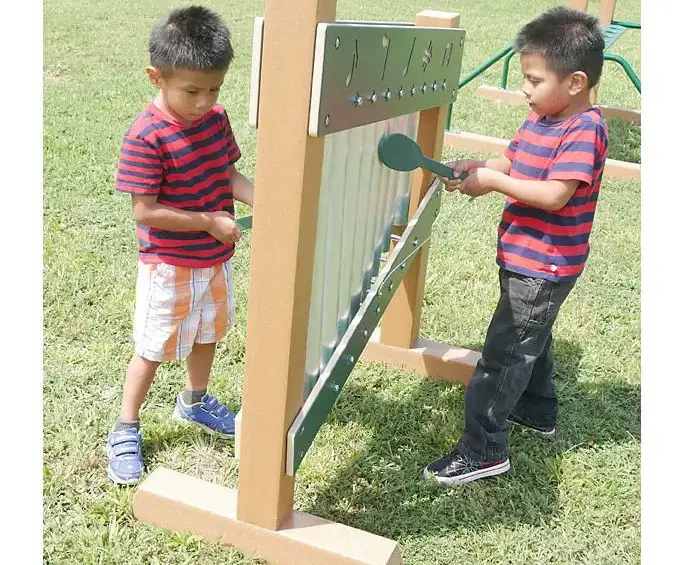 The Recycled Plastic Chime Wall brings the joy of music and sound exploration to young children in a safe, eco-friendly design. Its freestanding form and playful colors make it an inviting addition to any playground or early learning space.