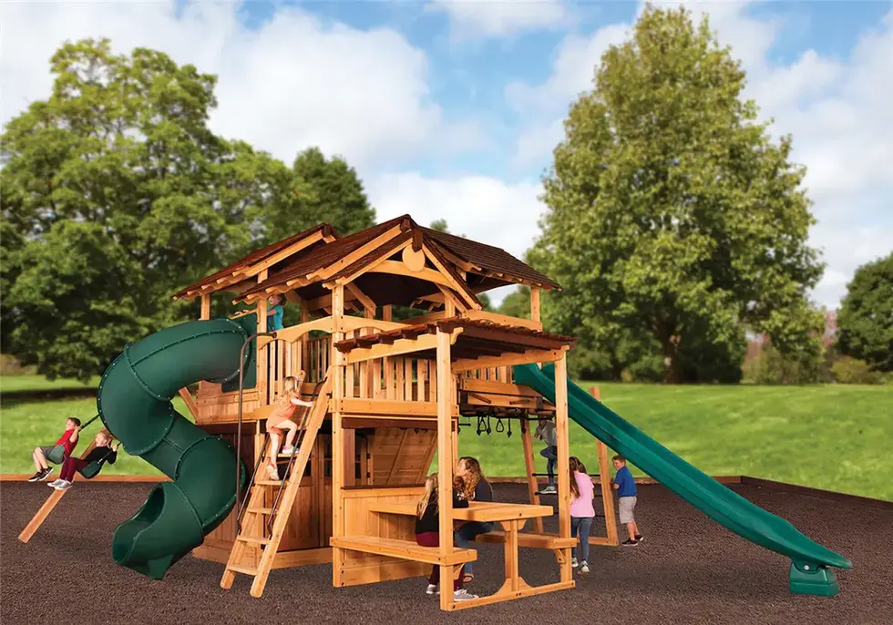The Titan Treehouse XL 7 swing set a premium backyard play structure for the whole family! The fort structure has two 7' high decks, a 6' tower, and a lower playhouse with 115 sq. ft. of play space. This swing set also includes wood roofs, gable extension roof, 2 - gable kits, 3 position 10' swing beam, 2 - belt swings, trapeze bar, 14' rocket slide, 7' spiral tube slide, 7' rock wall, 6.5' high ultimate climber monkey bars, pergola with side table, extra playhouse wall, and a 6' fireman's pole. Treehouse Series play sets include our exclusive limited lifetime warranty on all wood, metal, and hardware components. Playset shown with: • Titan Treehouse XL • Olympian Treehouse Tower XL • Wood Roofs • Gable Kit • Gable Extension Roof • 3 Position 10' Swing Beam • Steel Reinforced Swing Beam Kit • 2 - Belt Swings • Trapeze Bar • 6.5' Ultimate Climber • Loft XL • Loft Gable Kit • 14' Rocket Slide • 7' Spiral Tube Slide • Playhouse • 7' Rock Wall • Pergola with Side Table • Playhouse Window Wall • 6' Fireman's Pole