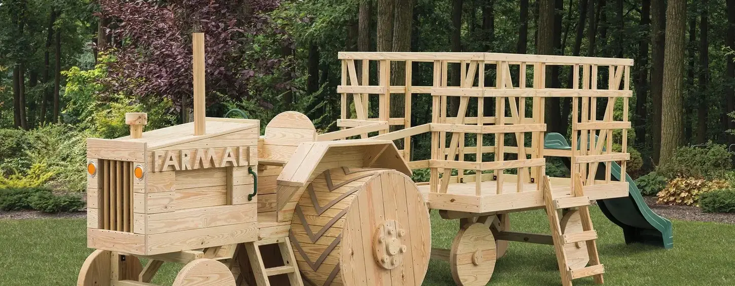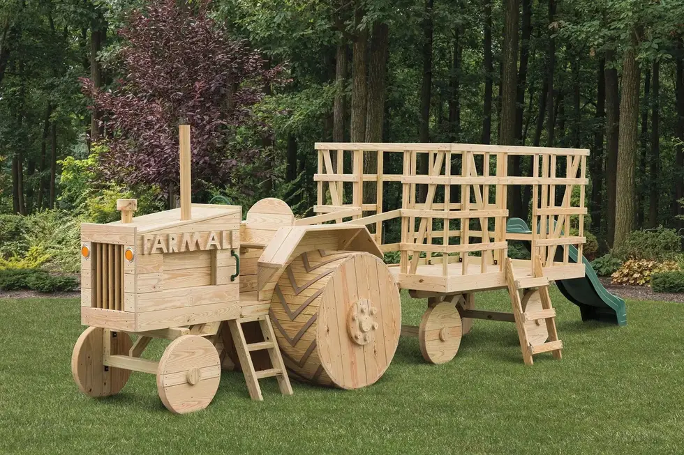Children will have endless fun pretending to be farmers with this tractor and wagon playset. Made from strong, durable wood, it’s built to last. The set includes an 8' slide, available in your choice of vibrant colors: blue, green, yellow, gray, or red. Perfect for outdoor play and imaginative adventures!