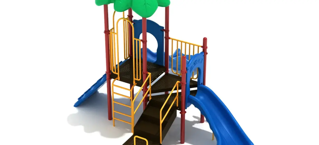 QUICKSHIP ITEM! Nestled like a tropical island in the heart of the playground, the Village Greens play structure features a unique Leaf Roof, sparking imagination and encouraging adventurous play. Two thrilling waterfalls cascade from the sides, with the first being a Wave Slide that includes a bump for an extra burst of excitement. The second is a Right Turn Slide, which curves and wobbles, giving children an added challenge as they descend. Before reaching the top deck and the slides, however, kids must first conquer the Figure Climber. With 16 angled holds arranged in a pattern, children can choose the best hand and foot placements to make their way up. An interactive Ship’s Wheel adds a creative touch, letting kids pretend they’re embarking on sailing adventures with friends. Constructed from durable, high-quality plastic and galvanized steel, the Village Greens playset is built to endure year after year of outdoor play. In stock items typically ship in 2-4 weeks. Installation not included. For an installation quote or any other questions, please contact Tarik Alherimi: tarik@pinestaterecreation.com